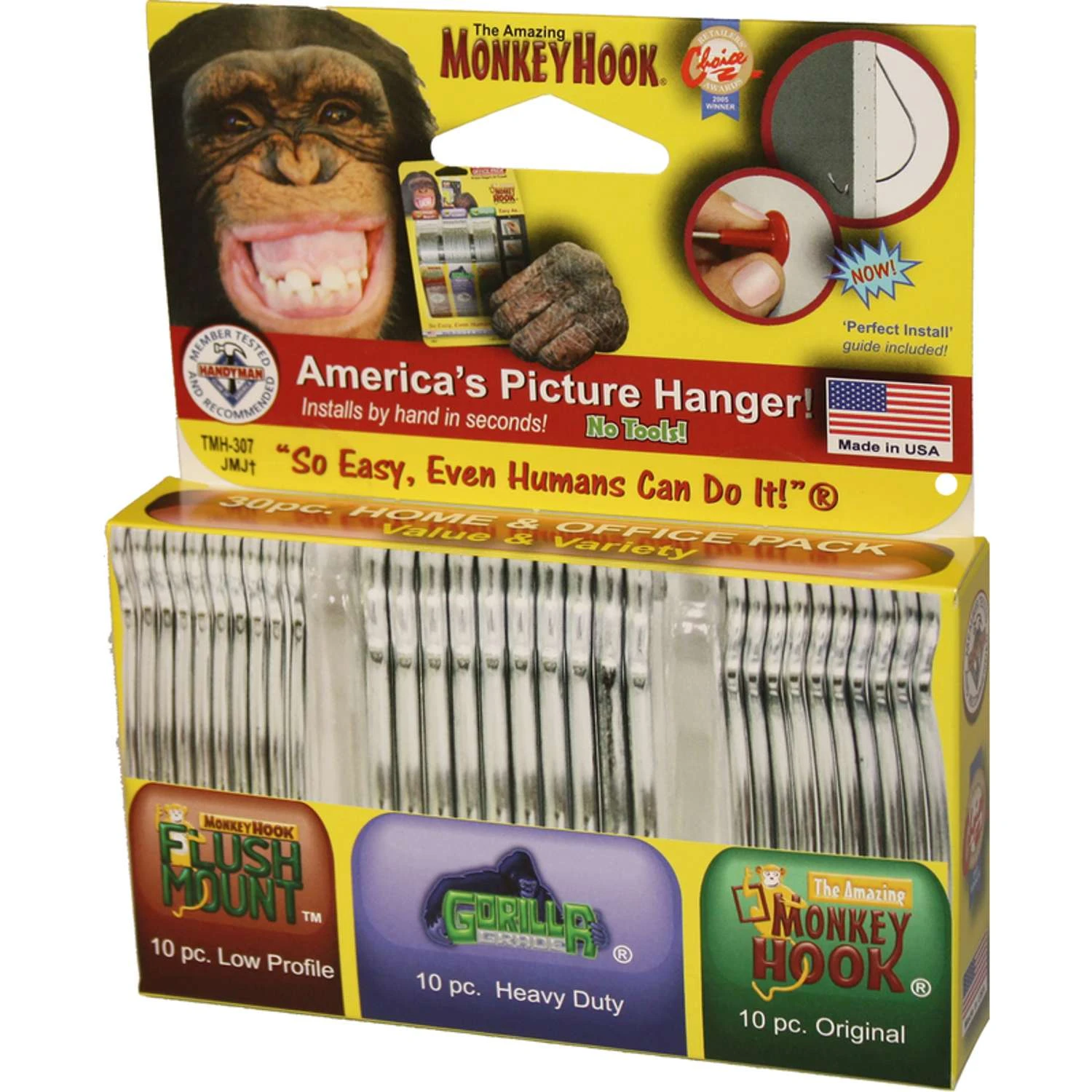 | What's Included | 10 Original, 10 Gorilla Grade, 10 Flush Mount Monkey Hooks and 2 Perfect Install guides |
