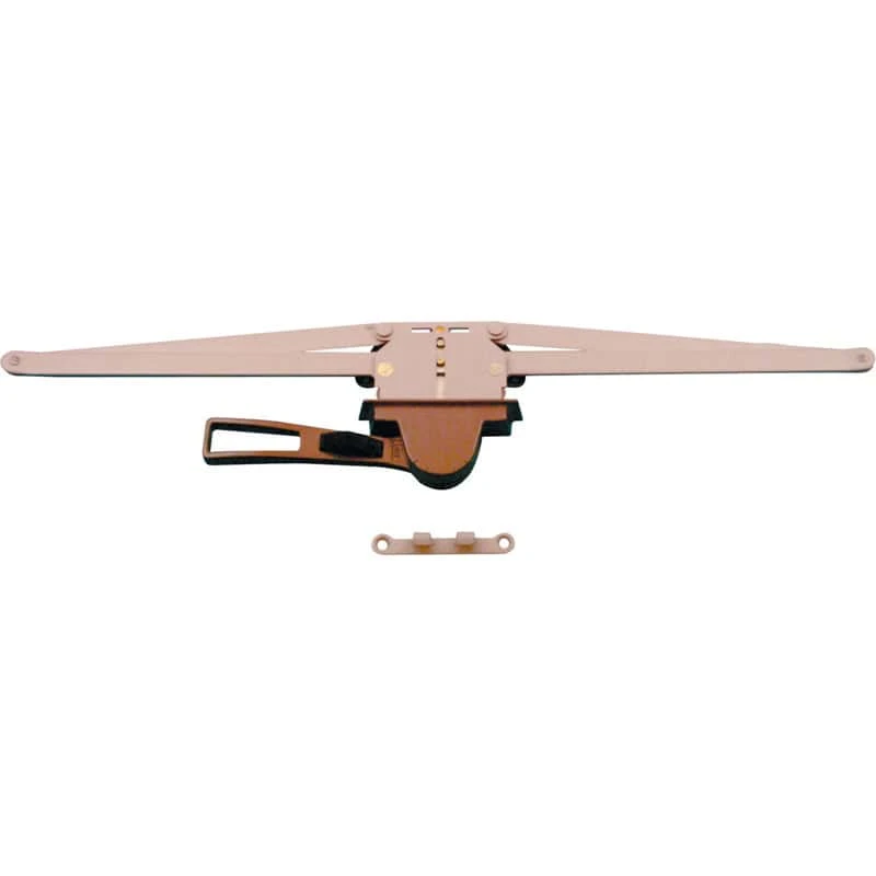 This operator is constructed from diecast zinc. It features a steel base plate, sash hook, and lever arms. This operator holds your window open in any of five given positions. It comes coated in a rust and corrosion resistant bronze painted finish. * 1 operator; 1 hook and 1 set of installation screws. Used on awning window Zinc diecast housing in bronze painted finish Holds window open in any of five positions