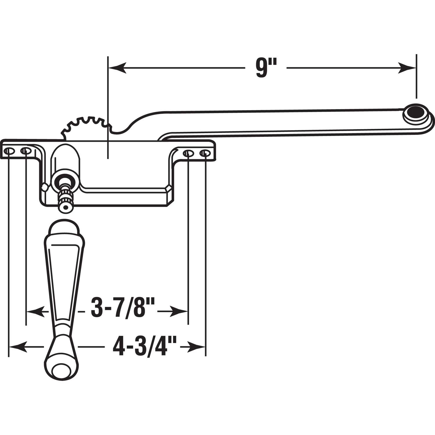 This casement window operator is a left-handed bronze square body type. It has a 9 in. steel arm with a round disc on the tip (some older styles had a small wheel instead of a disc). The disc slides in the Prime-Line part H 3529 casement track located on the bottom of the casement window. It is worm gear driven by a 3/8 in. crank spindle. The matching crank handle that fits onto the crank spindle and installation screws are included. Mounting holes available are 3-7/8 in. and 4-3/4 in. apart. Left handed square body crank handle (viewed from inside looking out) Mounting holes are 3-7/8 in. and 4-3/4 in. on center Arm is 9 in. from middle of the guide button to the middle of the crank operator while closed Heavy duty diecast zinc construction with a white finish Steel worm drive gear for durability Matching crank handle is included A Phillips head screwdriver is required for installation For further dimensional information, please see the line drawing