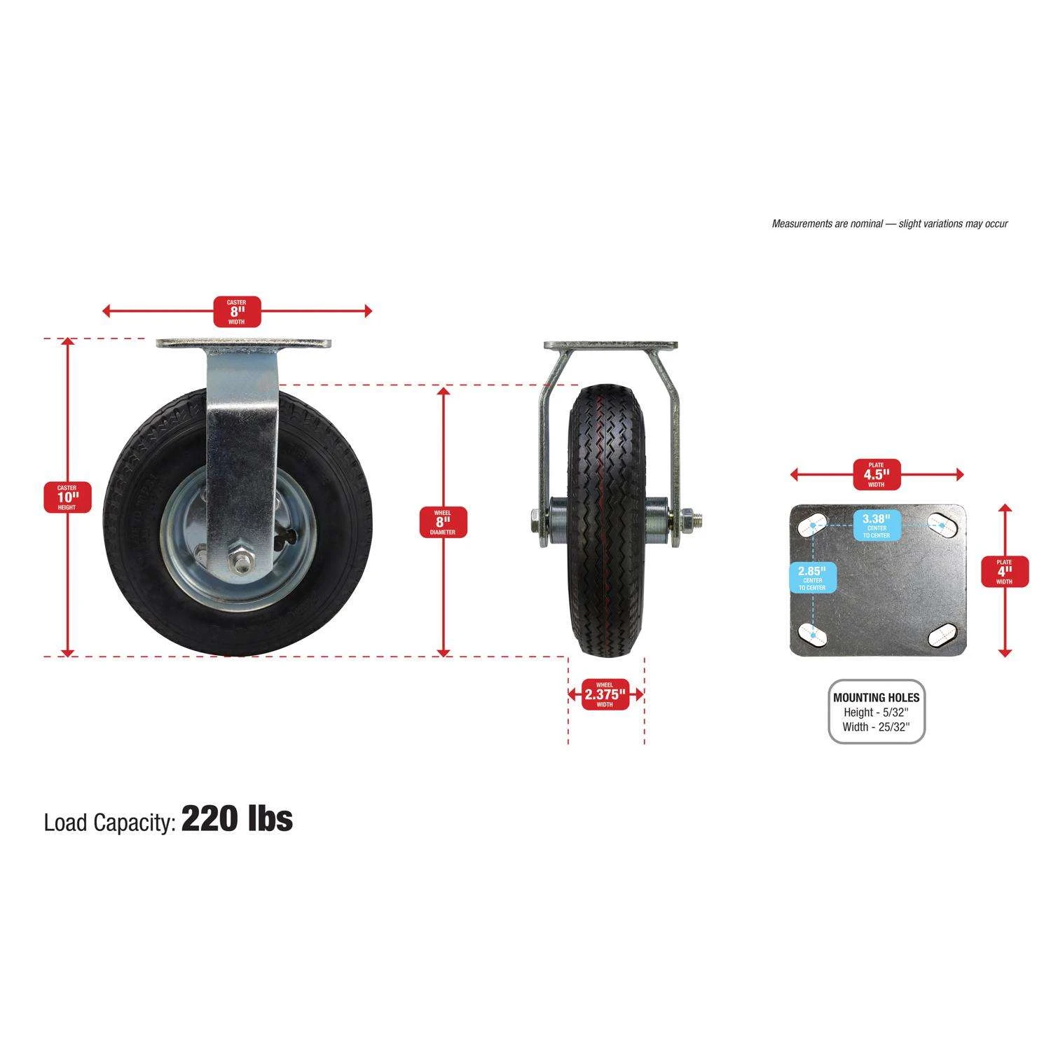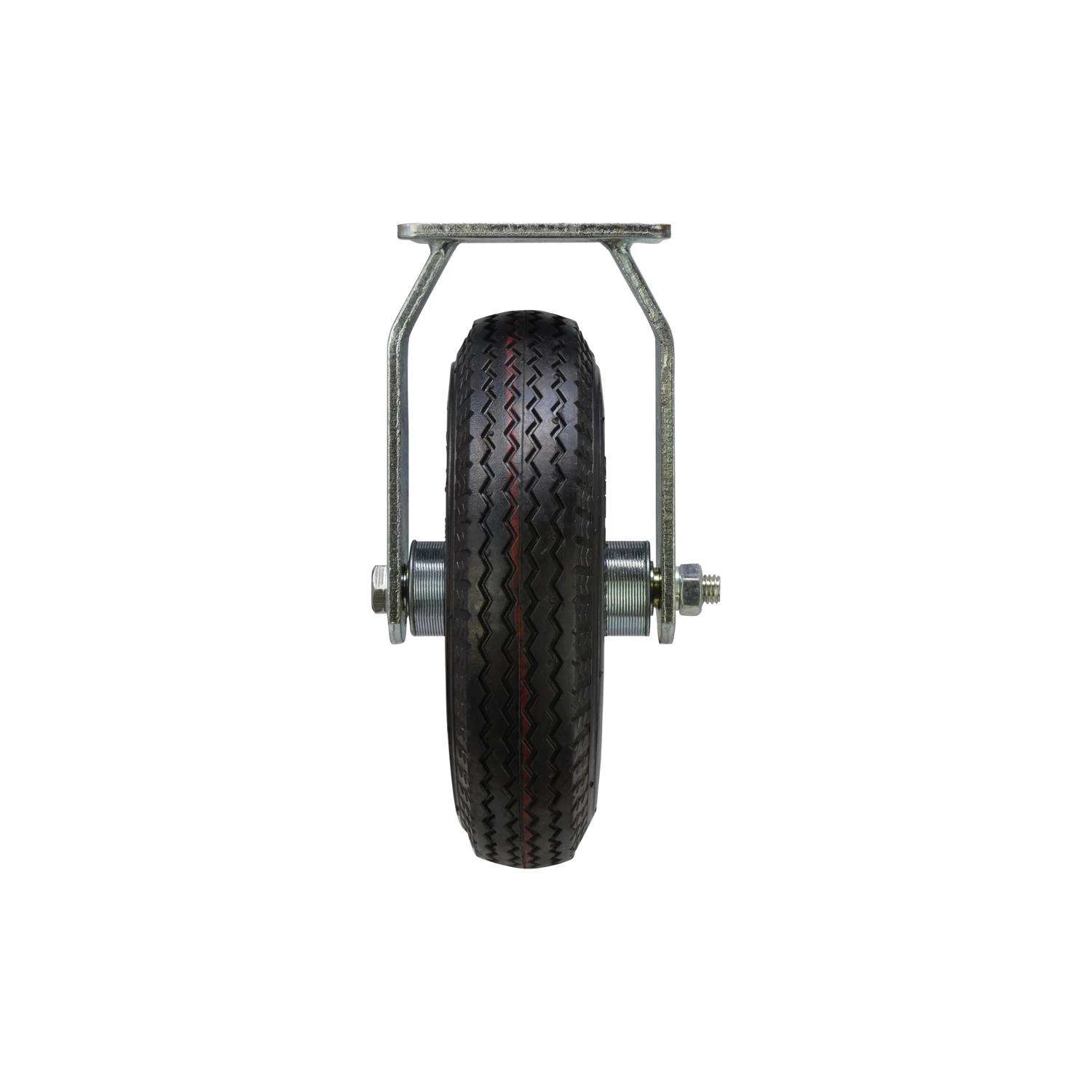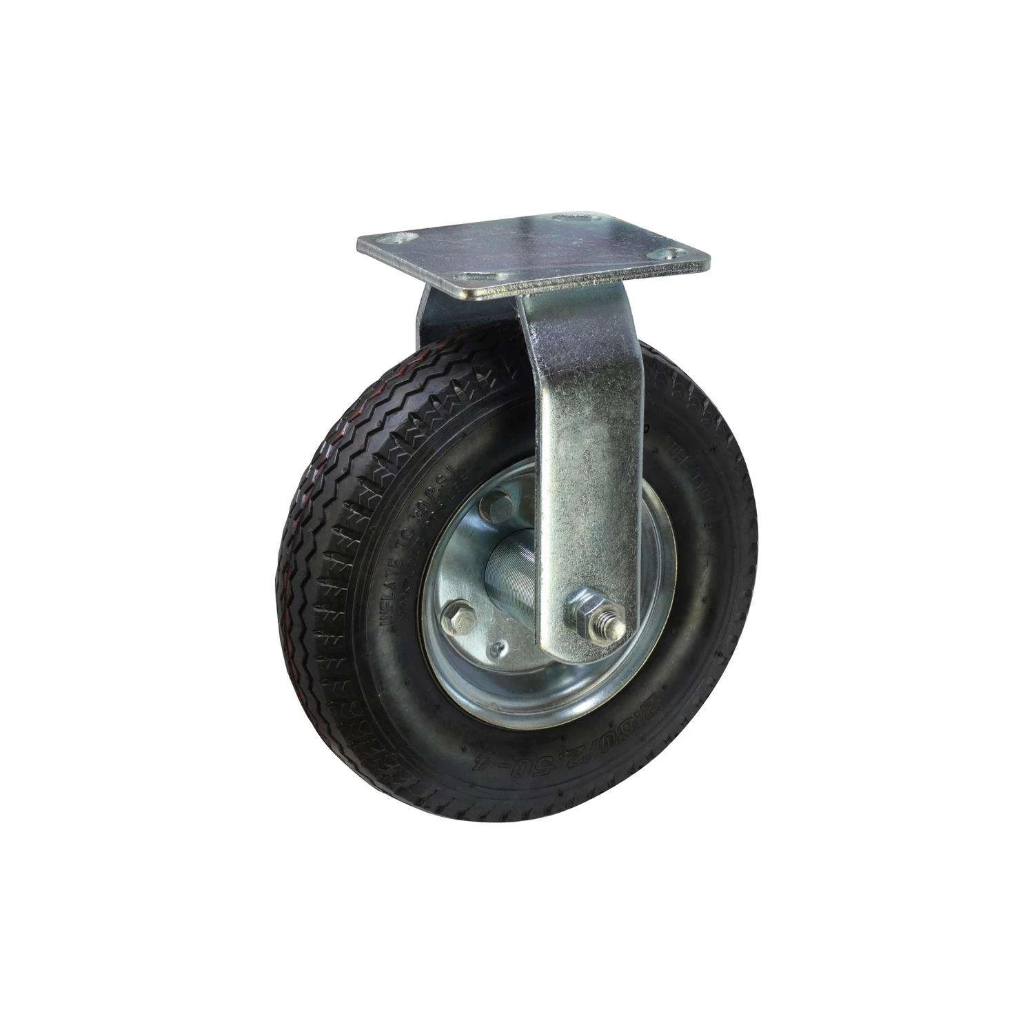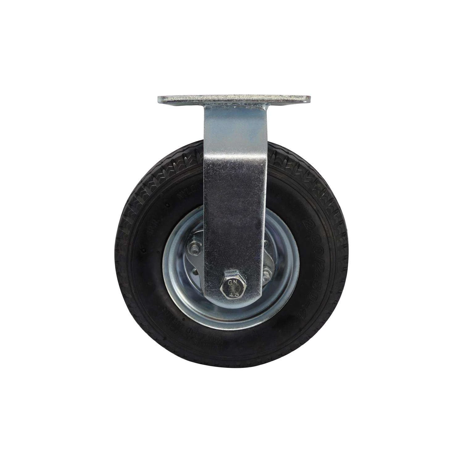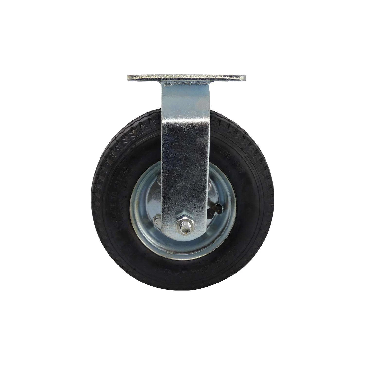 The Shepherd Hardware 9795 8 inch Pneumatic Caster Wheel, Rigid Plate, Steel Hub with Ball Bearings, 5/8 inch Bore Centered Axle. Black rubber air-filled wheel on steel hub with rigid plate mount A great choice to ensure extra cushioned protection of load and floor surfaces Wheel has standard saw tooth tread design